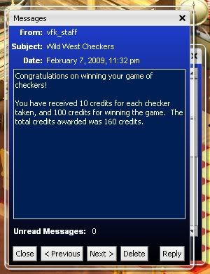 Finally got to play a game sort of. Everything was going well although I was behind 2 checkers, lol. Some other person went and sat ON my opponent this time which cancelled our game!  :sur: So given the amount of time and lag there...I "earned" 30 credits  :rofl1: Won't get rich there  :rofl1:  :rofl1: