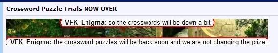 "I am not upset with VFK I am upset with what SEEMS to be repeated winners that seem to be able to finish something in 3 min that the next person takes 5 to do ?  I mentioned that to Enigma on the map, and she said to send in every crossword generator that you can find send a link to it, they have ways of defeating the use of them.....So If you find one, send them a link to it thru the help message."