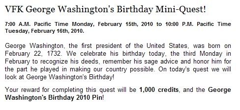 - Topic: VFK George Washington's Birthday Mini-Quest! 2/15 - 2/16